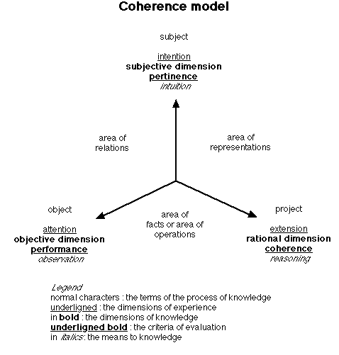 The Coherence model supplies criteria, as well as their ranking of importance, according to which all things are evaluated. The criterion of pertinence is associated with the intentional, subjective dimension - in what direction are we going, is it the " right " direction? The criterion of coherency responds to the rational dimension : do all the dimensions join together correctly and are they coherent with the initial intention ? Finally, the criterion of performance corresponds to the objective dimension - have the goals been achieved ?
